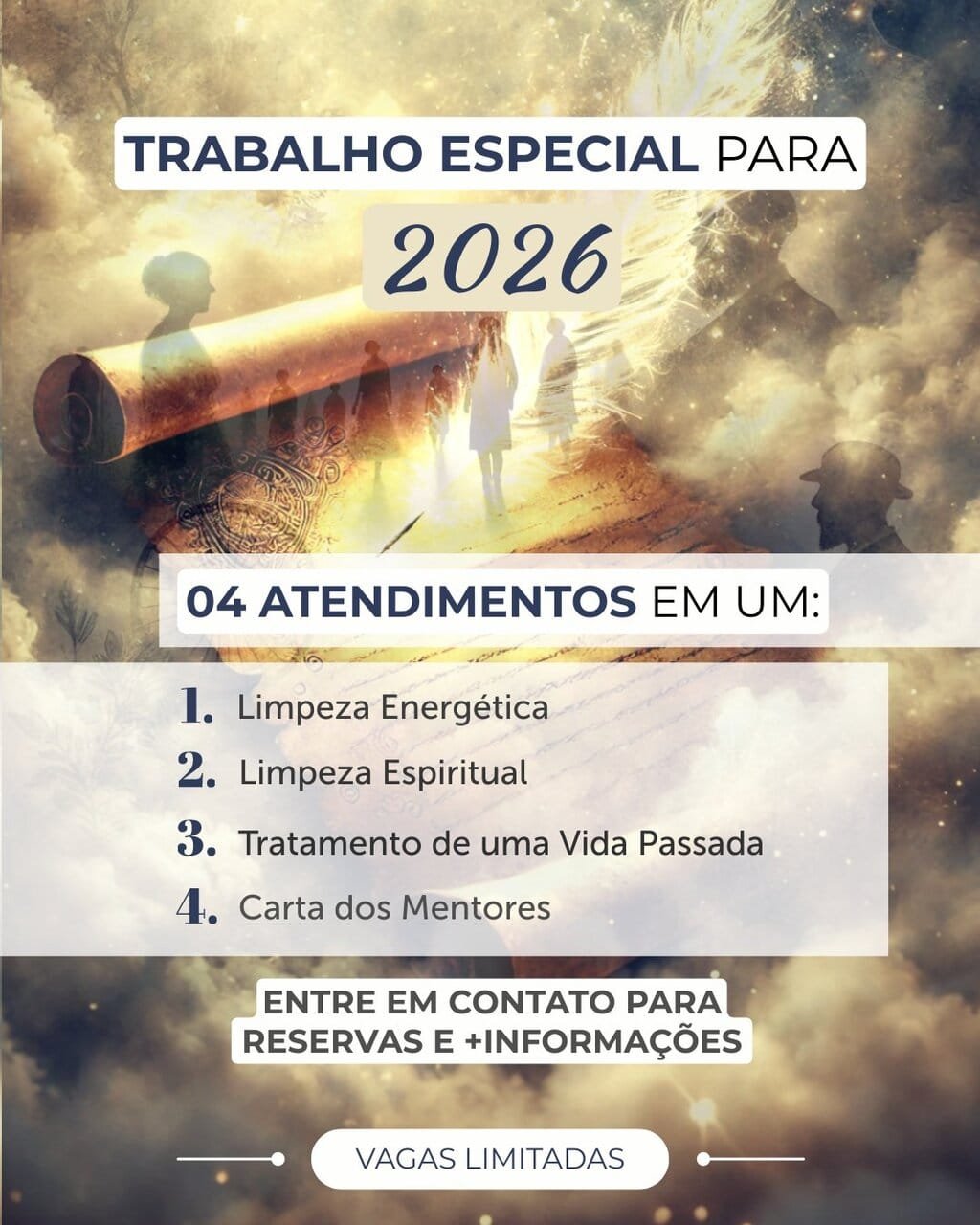 Este trabalho reúne quatro atendimentos integrados em um único processo, atuando em diferentes camadas do campo energético, espiritual e sutil, com foco específico nos desafios e potenciais que se apresentam para 2026.